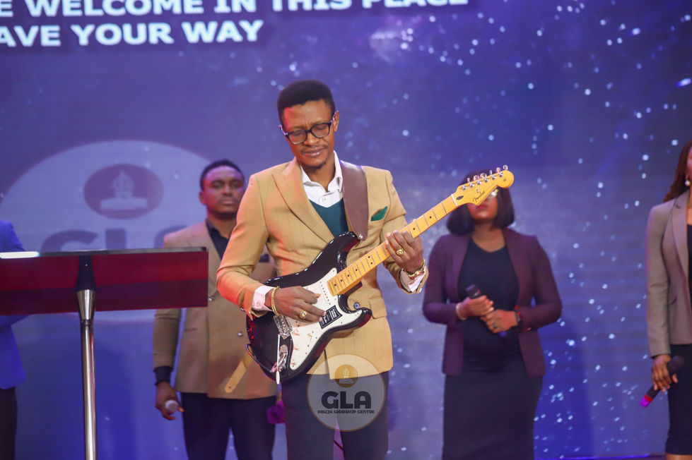 Capturing the energy and passion of live music performances, featuring a musician celebrating with the text "One True Odogwu" and playing an electric guitar on stage with a band.